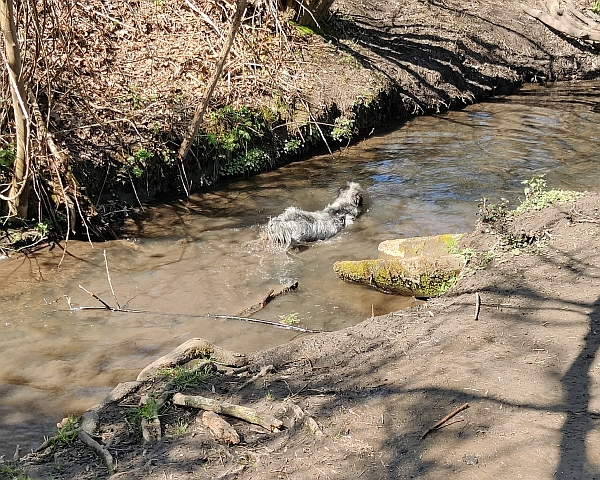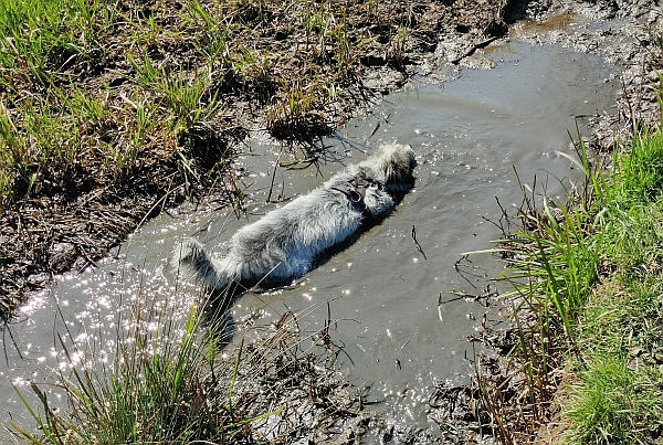 Und dann gibt es da noch das berühmte Schlammloch, das auf Hannes unwiderstehlich wirkt. Zwischen zwei Runden toben mal eben Fango - wer könnte da schon widerstehen? Antwort: Alle anderen Hunde - bis auf unseren! Glücklicherweise gibt es gleich daneben einen Bach, der zumindest bis zum freiwilligen Abspülen unseres Schlammmonsters klares Wasser führte. Vergangenheitsform!